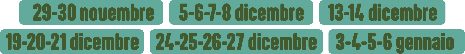 Aperto tutti i weekend, prefestivi e festivi, dal 29 novembre al 6 gennaio.